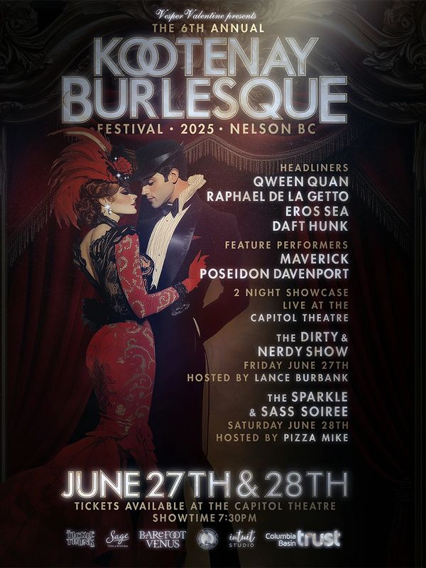 Lights, camera, action! Get ready for the 6th Kootenay Burlesque Festival on June 27 & 28 2025 at the Capitol Theatre. Join us for a weekend of unforgettable performance featuring Top Talents in Burlesque & Variety entertainment!